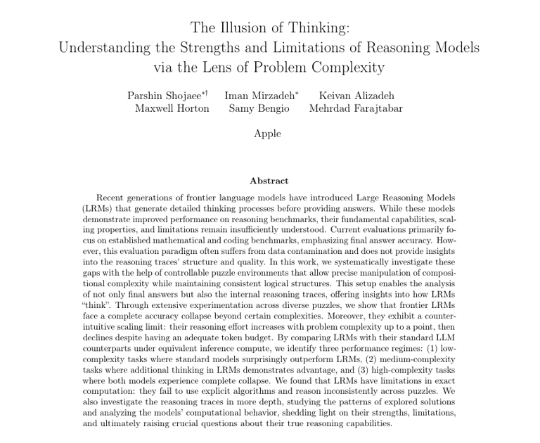 研究人員讓「有思考過程的AI」(LRM)和「一般AI」(LLM)一起解題,如果題目很簡單:一般AI解題速度比較快、更正確;在中等難度的題目中,LRM雖然仍能找到正確解法,但過程中經常先探索錯誤方向後才修正,研究說明這代表了其「思考過程」並不穩定,耗費大量資源卻效率不彰;而一旦複雜度再往上提升、增加變項或步驟數,LRM與LLM都出現準確率急劇下降、甚至完全答錯的情況。