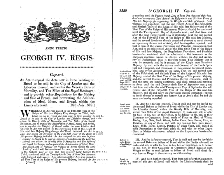 難以消化、潮濕、帶有淺灰色的大麵包(quartern loaf)重達四磅,這種麵包之所以得名,是因為通常會被切成四等分(quarter)販售。根據1822年頒布的《倫敦麵包法案》,每個大麵包的標準重量為四磅15盎司,約略接近五磅(約2.2公斤)。到了1846年,這種麵包的價格為八便士又半文錢。