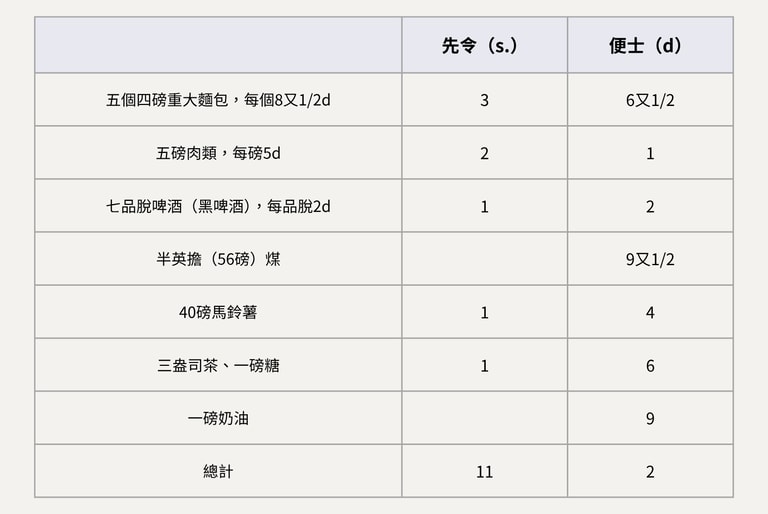 這個家庭四分之三的收入都花在食物與煤炭上。而15先令中所剩無幾的那一部分,還得用來支付全家居住空間的房租,以及購買蠟燭和其他必需品。至於衣物、鞋子、醫療、緊急開支,甚至是任何形式的娛樂,則完全無從負擔。