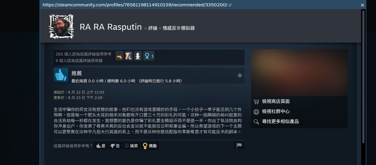 在《情感反詐模擬器》Steam平台的留言區中,獲得最多按讚的評論寫道:「生活中騙你的撈女沒有悲慘故事。每一個相親對象都可能開口要三十萬的彩禮,這種臨時起意的合法搶劫每一秒都在發生。」