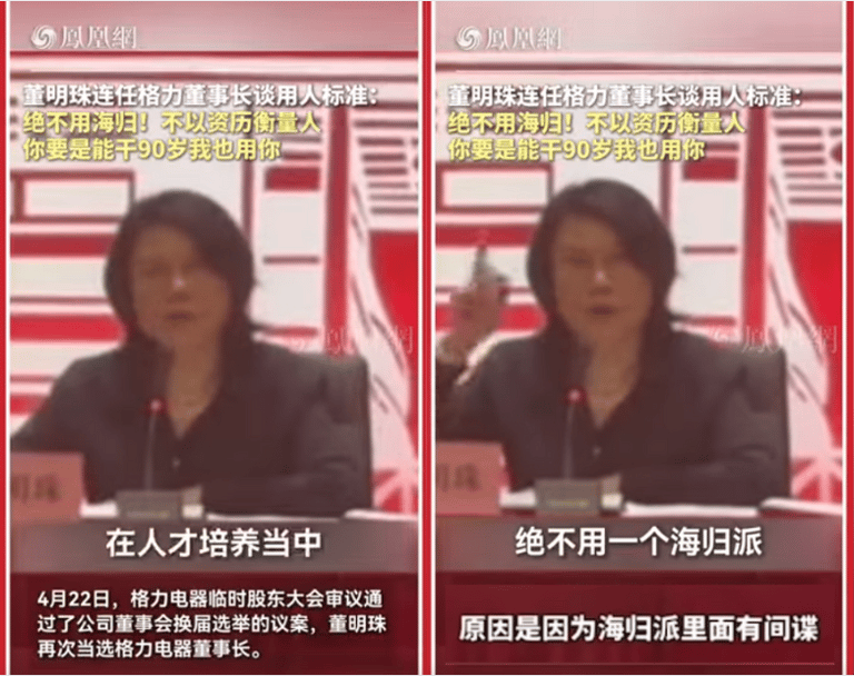 中國國營與民營部門對「外國背景」的戒備不僅存在於政策層面,也滲透至企業文化。中國大型家電品牌格力電器董事長董明珠在今年公開表示,她傾向不錄用海外歸國者,因為他們「可能是間諜」。這番話在中國社群媒體上引起一片譁然,許多網友批評這種觀點會加劇對留學人才的歧視,也不利於中國的國際競爭力。