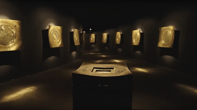這個裝置兼具雕塑與聲響,由20個大型拋物面銅板組成,從牆面向外彎曲,如金色衛星碟。每個銅板背後隱藏一個換能器(類似喇叭)和槌子,對迷你大腦的神經信號作出反應——填滿空間的是一片屏息、漂浮的音景。