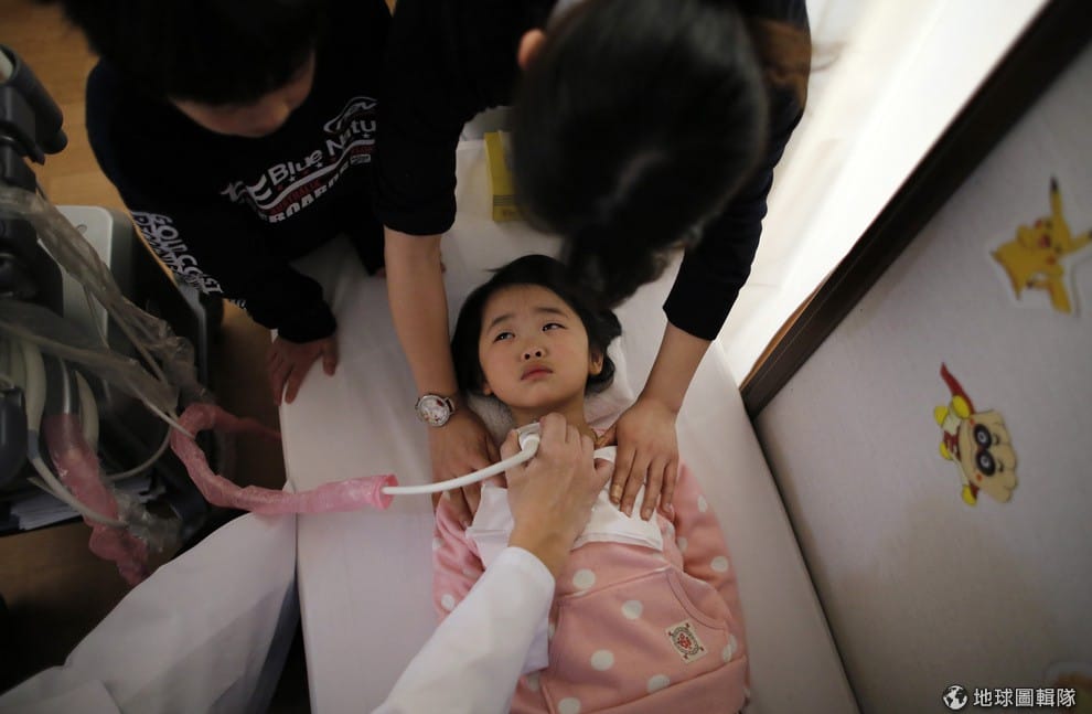 福島縣二本松市(Nihonmatsu)的組合屋社區中,當地的診所正在替民眾做甲狀腺功能檢查,照片中的5歲小妹妹躺著讓醫生進行檢查,一旁是護士小姐和她的哥哥。