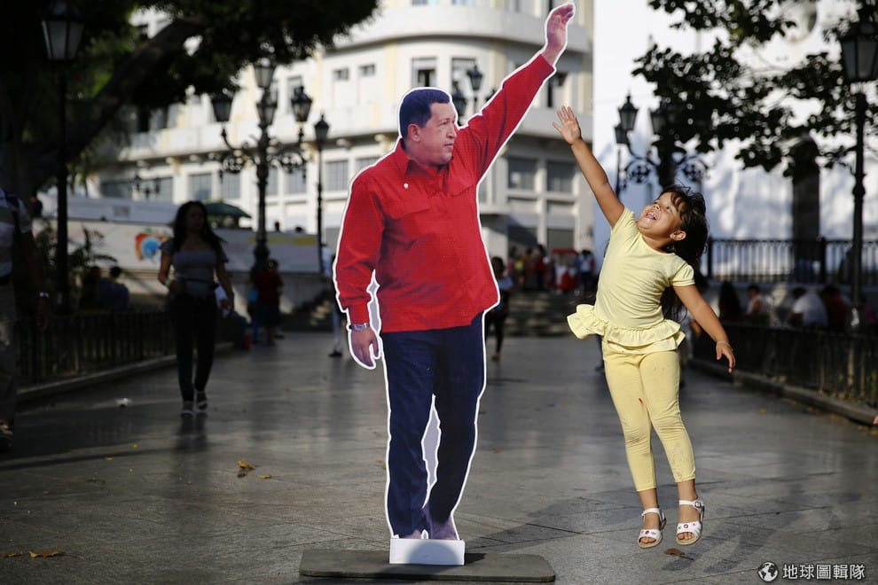小女生站在已故前總統查維茲(Hugo Chavez)的人形看板旁,為了悼念查維茲逝世周年,委內瑞拉當地舉辦為期一周的紀念活動,這對近日飽受民眾反抗壓力的現任總統馬杜洛來說,無疑是喘口氣的空檔。