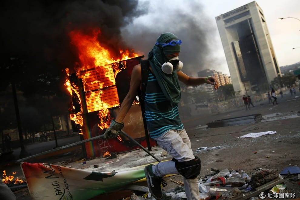 反政府示威者經過一座起火燃燒的報攤旁,拉丁美洲各國將派出代表,針對近期委內瑞拉發生的流血衝突進行商討。