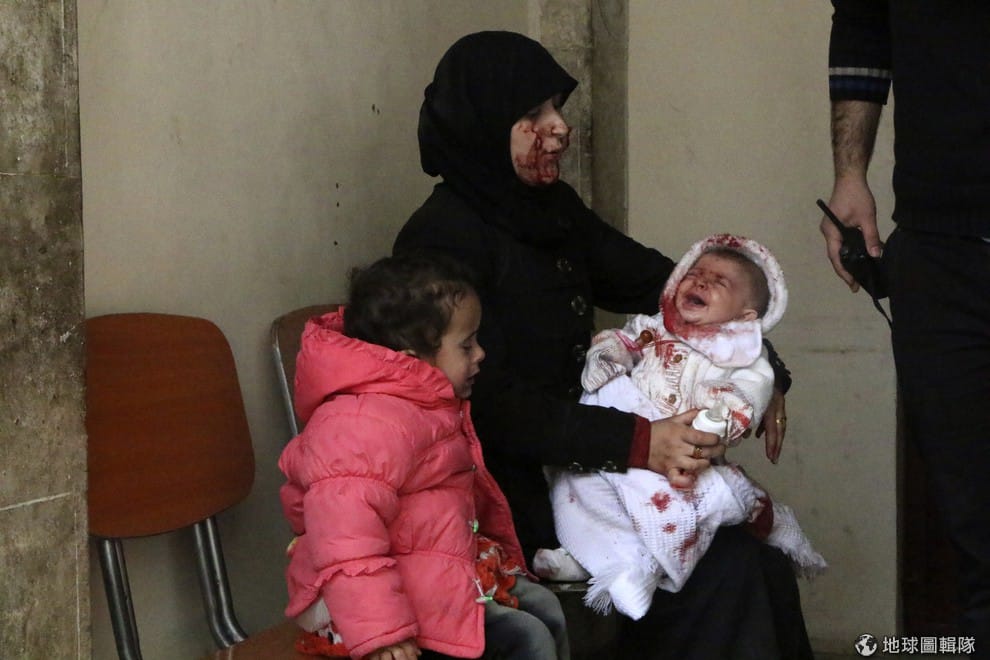 逃過政府軍空襲的女性,滿臉是血地抱著孩子坐在醫院中
