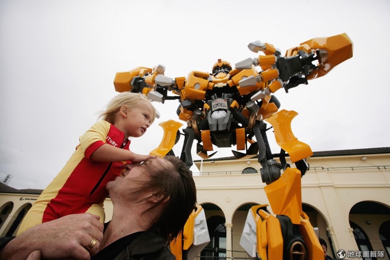 澳洲邦迪海灘為了要宣傳變形金剛DVD的發行,特地展出了這尊重達3頓、5公尺的高的大黃蜂!小弟弟開心到要爸爸把他舉高高看清楚一點!圖片來源: Matthew Vasilescu for Paramount Pictures Australia via Getty Images