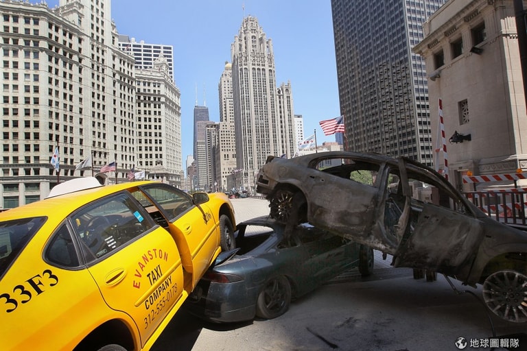 在芝加哥的拍片現場,隨處都是這樣「擺好的意外現場」!圖片來源:Scott Olson/Getty Images