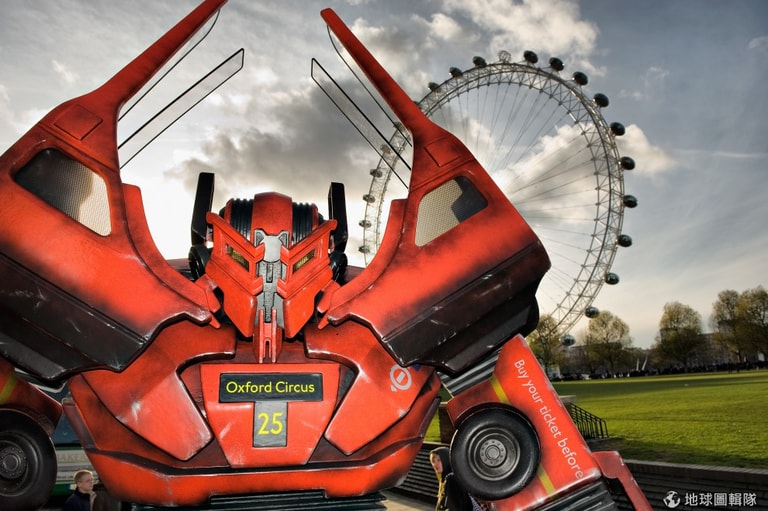 這位粉絲的功力一點都不輸電影公司人員,帥氣的巴士變形金剛用倫敦塔橋當背景,瞬間變成英國最佳代言人一樣。圖片來源:Marco Secchi/Getty Images for Paramount Home Entertainment