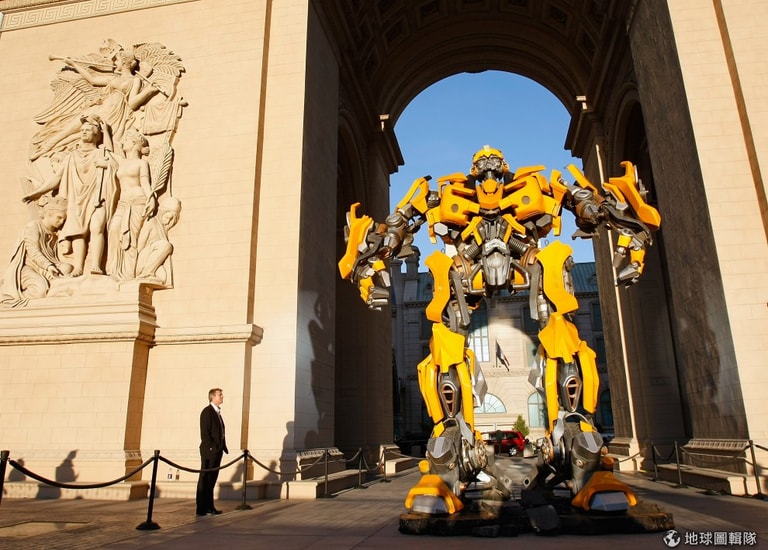 拉斯維加斯複製的巴黎凱旋門前也放上帥氣的大黃蜂。圖片來源:Ethan Miller/Getty Images