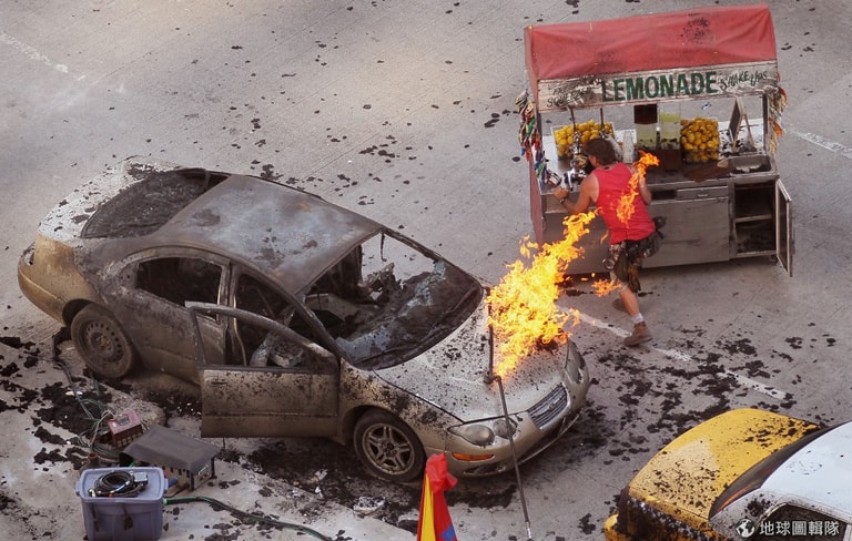 芝加哥的拍片現場中,正在進行變形金剛3的準備工作,可以看到工作人員為了做出災難場景點燃火焰!圖片來源:Scott Olson/Getty Images