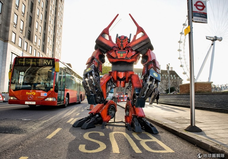英國的變形金剛大粉絲,看完電影不過癮,所以自己乾脆用公車的零件組一台來看看!好炫喔!圖片來源:Marco Secchi/Getty Images for Paramount Home Entertainment
