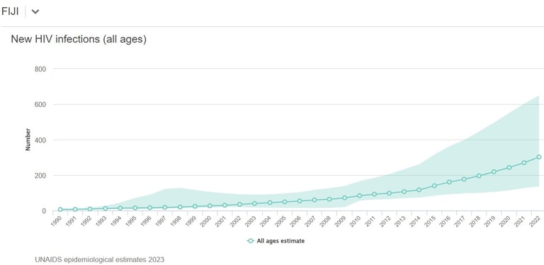 根據聯合國愛滋病規劃署(UNAIDS)的數據,自2014年至2024年,斐濟的新HIV感染數量激增了13倍,2024年預計將有1,583例新診斷病例,其中41例年齡在15歲以下。約一半的新診斷患者表示,他們是透過共用針頭感染HIV的,儘管不清楚其中有多少人是故意分享血液。