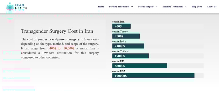 根據英國內政部一份2022年的報告,伊朗每年約進行4,000例性別重置手術,比英國和法國加起來的數量更多。由於在伊朗,接受性別重置手術的價格低廉,吸引許多來自澳洲、美國、英國與歐洲的跨性別人士;此外,伊朗是少數開放跨性別者接受性別重置手術的伊斯蘭國家,因此也有許多客戶來自周遭禁止此類治療的國家,例如伊拉克。