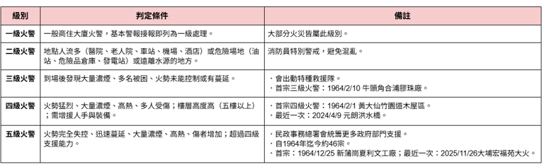 根據香港的火警分級制度,火災警報等級以一至五級劃分,數字越高表示火勢越嚴重。當現場出現以下情況,火警便會升至四級:
