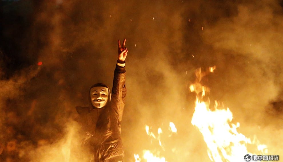 戴著面具的示威者在大火中舉起手,他與其他民眾抗議現任總理埃爾多安(Recep Tayyip Erdoğan)的施政。