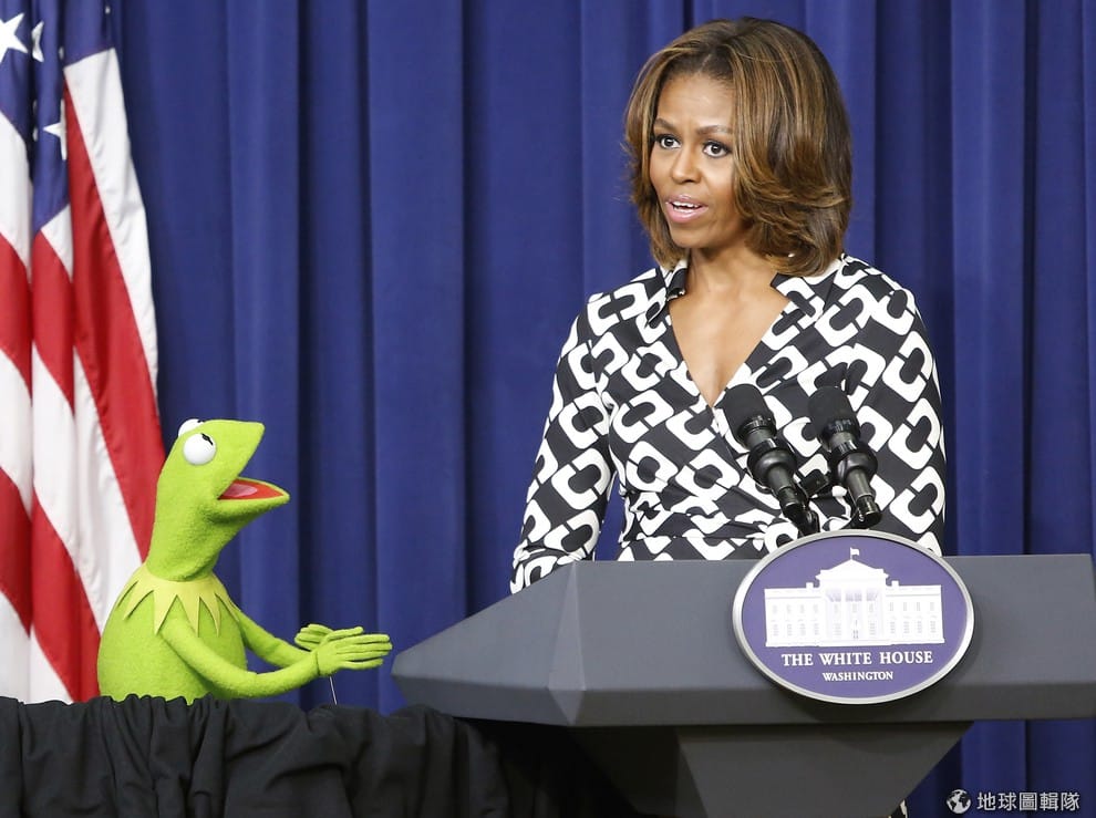 為戲宣傳的柯密特青蛙(Kermit the Frog)站在美國第一夫人蜜雪兒身邊,12號這天,科密特青蛙向美國軍人的家眷們介紹即將上映的電影《玩偶大電影2》(Muppets Most Wanted)。