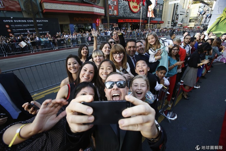 喜劇演員格威斯(Ricky Gervais)和粉絲們一起在好萊塢知名的「酋長石劇院」(El Capitan theatre)前自拍,這裡即將在21號時上映由布偶科密特青蛙主演的《布偶大電影2》(Muppets Most Wanted),格威斯本人也會在電影中扮起Dominic Badguy一角。
