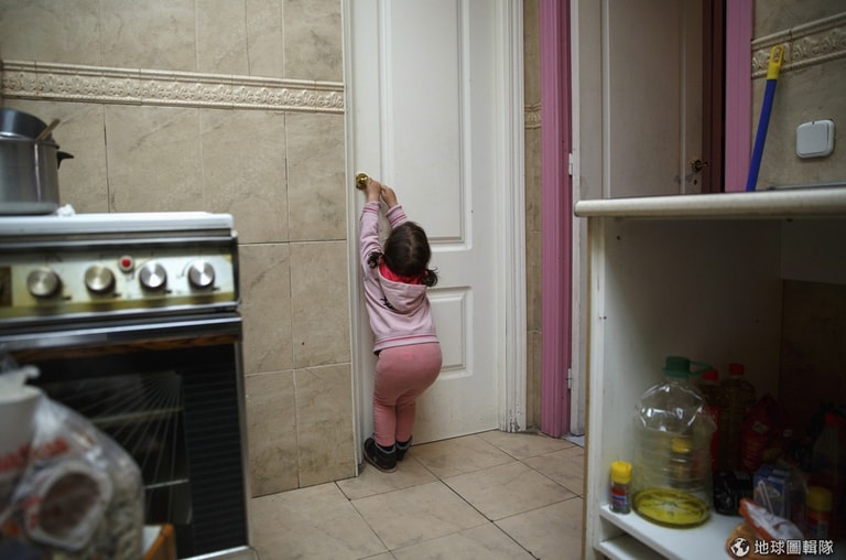 2歲的薩米拉(Samira)用力拉門把想把門打開,她和大人們一起擠身在借住的公寓中。