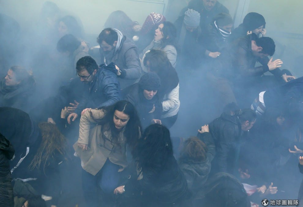 因為15歲男孩過世又再度掀起的怒火開始在土耳其街頭延燒,12號這天,可以見到示威者持續在街頭表達對總理的不滿。照片中的示威者受不了警方丟擲的催淚瓦斯四處逃竄。