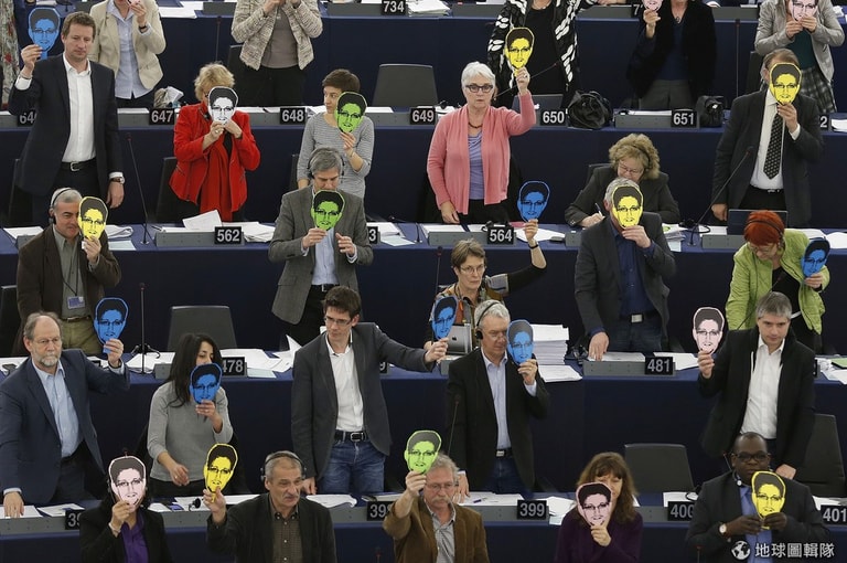 照片中是歐洲綠黨─歐洲自由聯盟(European Greens─European Free Alliance)的黨員,他們手中拿著愛德華‧斯諾登的頭像在手上,12號這天,歐洲議會針對美國國安局(NSA)監察計畫對歐盟成員的衝擊等議題,進行投票。