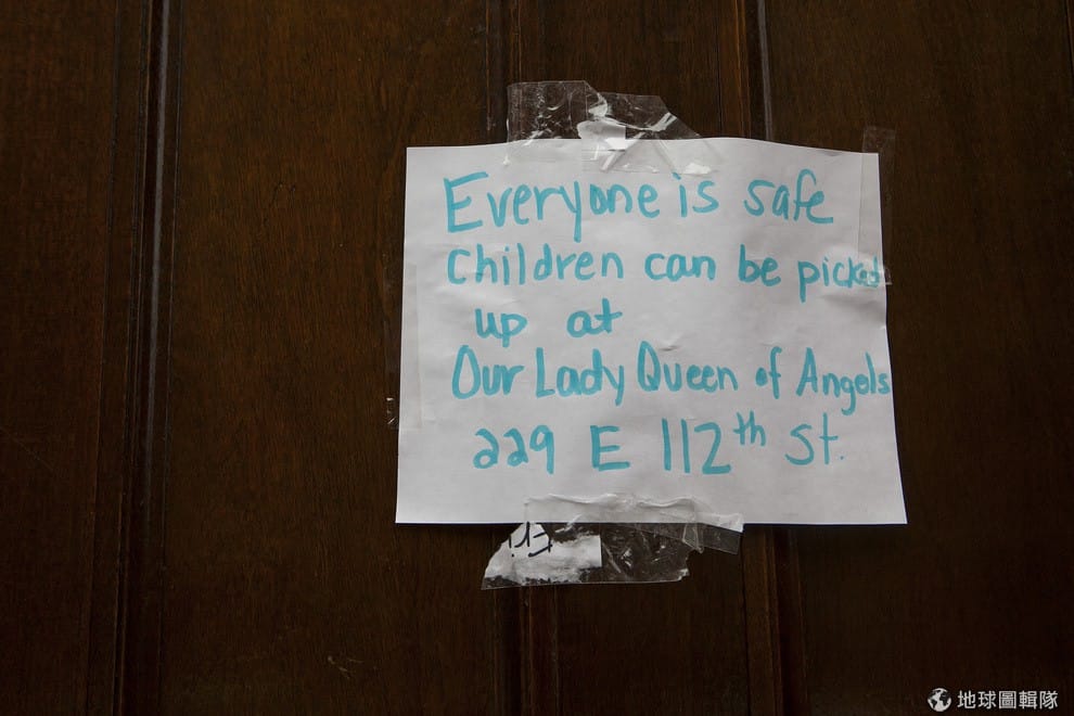 在倒塌大樓附近的教堂門前,可以看到紙條寫著「大家都平安無事,可以到女王殿下天主教堂(Our Lady Queen of Angels)接孩子們」。