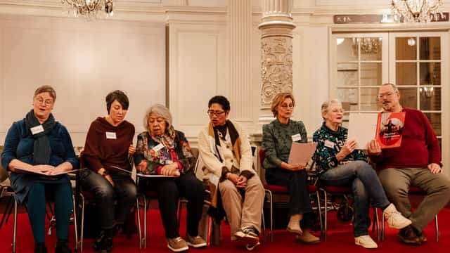 瑪爾特請大家一邊唱,一邊想像屬於自己的夢想之地。音樂結束後,78歲的伊馮德里森(Yvonne Driessen)早已紅了眼眶,她指著歌本中一名女性抱著嬰兒的照片,她說「這讓我想起小時候被母親抱著的感覺。對我來說,那就是家。」