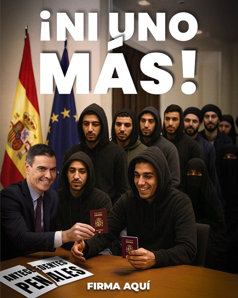 西班牙極右派「呼聲黨」(Vox)也強烈抨擊這項政策,發文稱:「一個都不能多!」(¡Ni uno más!),並配上AI生成的桑切斯與移民會面的圖片,桌上文字為「犯罪紀錄」(Antecedentes Penales)。
