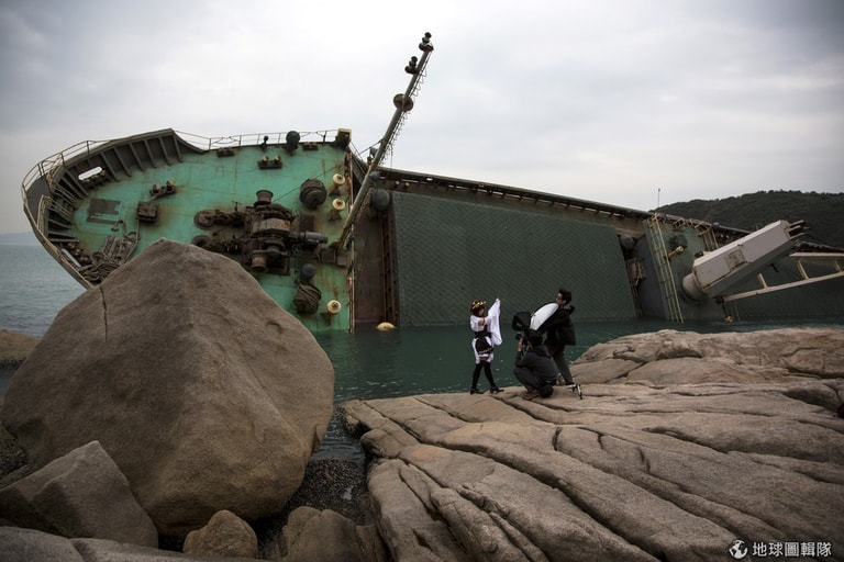 民眾扮裝成動漫人物,他們站在日出東方號(the Sunrise Orient)前拍照。長90公尺、重達2,500噸的郵輪日出東方號,日前受到船員拋棄後漂流到香港長州附近。當地媒體報導中談到,船員因害怕他們關掉引擎時會發生沉船,拒絕再回到船上,這艘船就這麼一路漂流到長州附近。