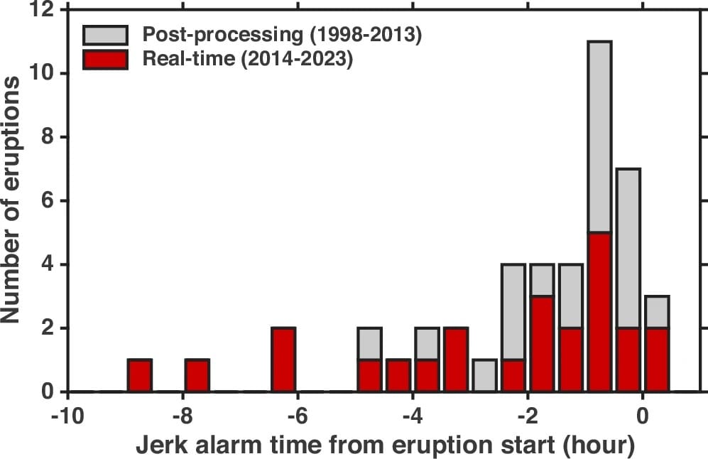 該圖為Jerk警報訊號與火山噴發的時間差統計,圖中紅色部分為2014年至2023年間的即時監測情況,灰色部分為1998年至2013年間的事後測試情況。