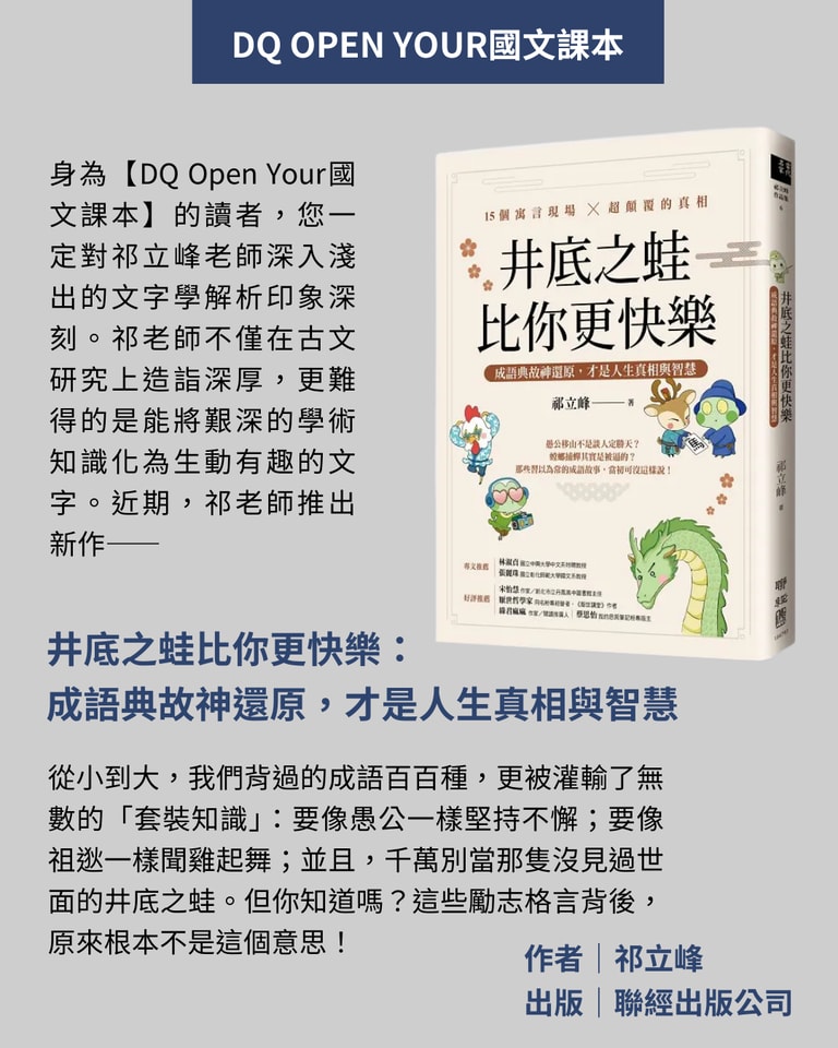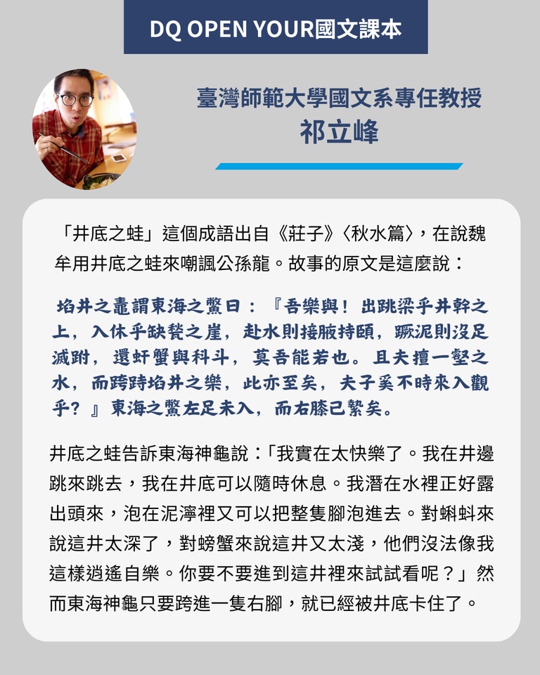 DQ邀請到臺灣師範大學國文系祁立峰教授,一起來為小隊員們說說井底之蛙背後的故事。