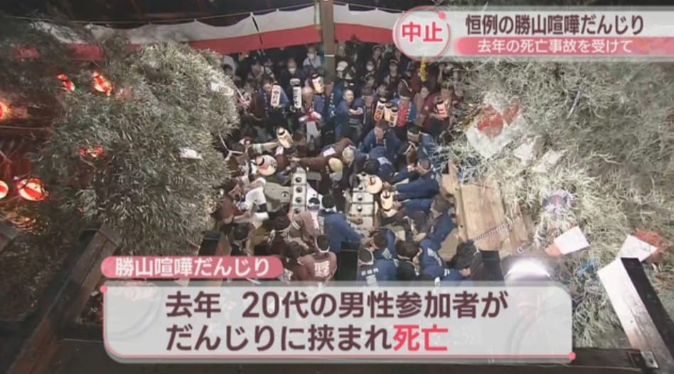同樣的改變也出現在岡山縣的「勝山打架山車祭」(勝山喧嘩だんじり祭)。2023年,一名23歲負責抬山車的男子,不慎被兩輛山車夾住,送醫搶救後因出血性休克身亡。事故發生後,該祭典停辦一年;直到2025年復辦時,主辦方將地車對撞前的助跑距離縮短為以往的一半。這項調整雖降低了祭典的「視覺衝擊力」,卻在最大程度上保障了參與者的生命安全。