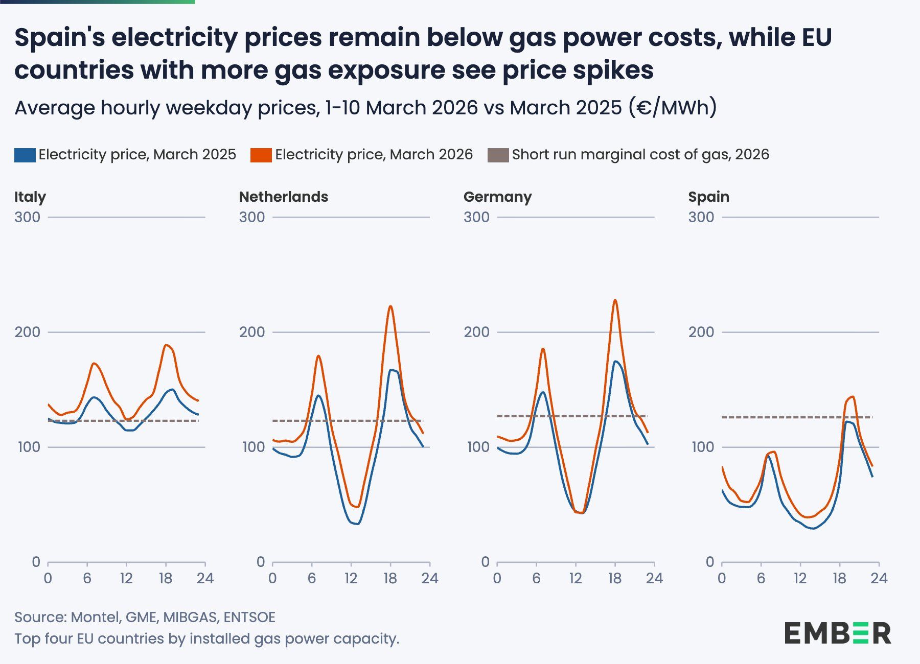 中東戰爭以來,3月西班牙的平均電價仍低於天然氣發電成本,也低於其他擁有大量天然氣發電裝置容量的歐盟國家。報告指出,3月第一週,德國、荷蘭、義大利和比利時的電價都升至年內最高水準。而西班牙、葡萄牙、法國和北歐等天然氣依賴程度較低的國家,受到的影響較小。