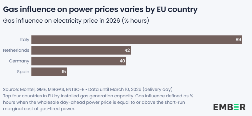 自2019年以來,西班牙的風能和太陽能發電容量增加一倍,新增超過40吉瓦,使昂貴的化石燃料發電對電價的影響降低75%。截至目前,西班牙2026年天然氣發電對電價的影響只占15%,而義大利則高達89%。意指在西班牙,天然氣只影響電價15%的時段。