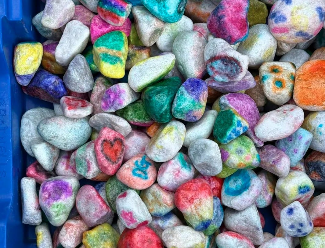 病童們發揮創意,在卵石上彩繪了愛心、樹木、小房子、毛毛蟲、企鵝,甚至還有求婚戒指。有些孩子更為心儀的企鵝量身打造專屬卵石——例如有一位小朋友畫了好幾顆「瑪芬蛋糕」,就盼著能被企鵝瑪芬相中。