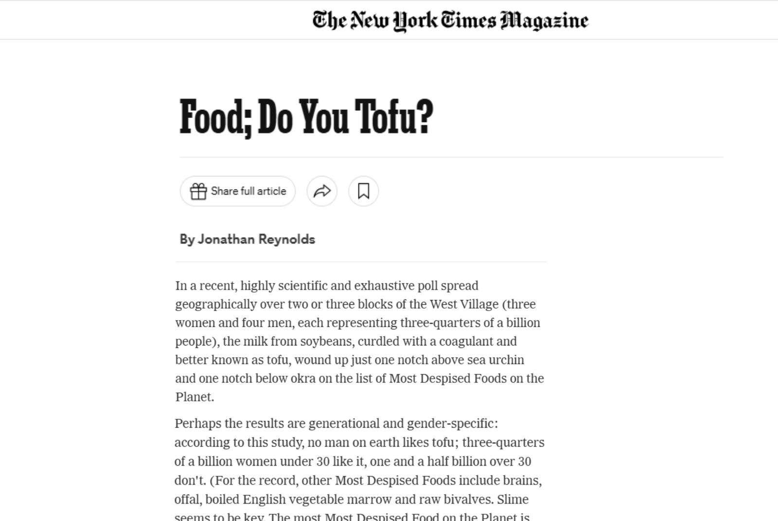 過了17年,到了2000年,同一份報紙上有文章宣稱「對於多數美國人來說,像豆腐這樣的大豆製品缺乏吸引力,無論以任何方式烹調都無法下嚥。」同一年,《紐約時報》的食物專欄作家強納森·雷蒙德斯 (Jonathan Reynolds) 開玩笑地把豆腐列入「地球上最受鄙視食物清單」中,名列海膽和秋葵之間。