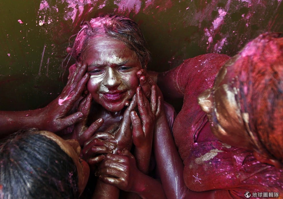 照片中的女孩被眾人包圍抹上彩色粉末,印度當地正值迎接春天的「色彩節」(Holi)期間,處處可見身上滿是七彩粉末的民眾。