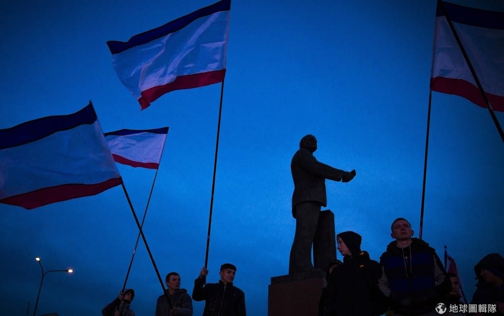 16號公投結束後,人們邊揮舞克里米亞自治國的旗幟,邊等待公投的初步結果出現。