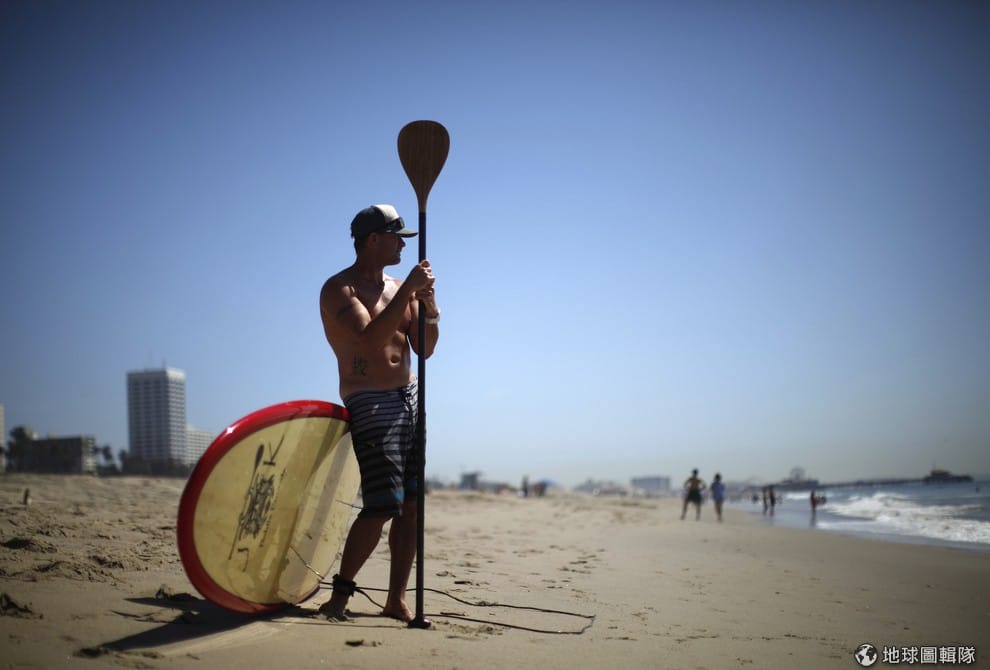 美國加州的聖塔莫尼卡海邊,可以見到單槳衝浪者(paddleboarder)站在沙灘上,當地的氣溫在16號時出現華氏90度高溫(攝氏32度)。