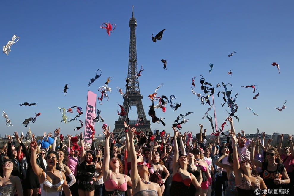 參加打擊乳癌活動的民眾一起朝天空丟胸罩。參加第五屆「春天粉紅胸罩與拋胸罩與一同打擊乳癌」(5th Pink Bra Spring and Bra Toss and help Push Up the Fight Against Breast Cancer)活動的民眾聚集在巴黎鐵塔前,籌辦活動的粉紅胸罩市集(Pink Bra Bazaar)主要聚焦在傳達乳癌防治的教育上,同時提供乳癌患者需要的幫助。