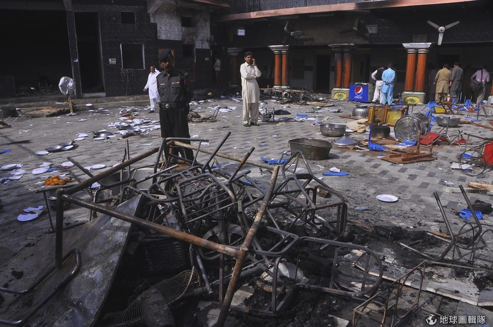 維安人員站在毀壞的寺廟中,16號晚間,許多憤怒的巴基斯坦人衝入當地一座印度教寺廟中,並放火燃燒建物,根據當地員警和領袖表示,人們是聽聞有印度教信徒褻瀆可蘭經,這觸怒了信仰伊斯蘭教的民眾。