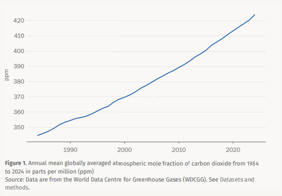 2024年(報告中有完整全球數據的最新年度),大氣中CO₂的全球年均濃度來到了423.9ppm,是過去200萬年來的最高值。值得注意的是它的速度,直接比 2023年多了3.5ppm,創下1957年開始現代觀測以來最大的年增幅。報告指出,這次破紀錄的增幅背後有三個推手:化石燃料排放、野火排放增加,以及陸地和海洋碳匯的效能降低。