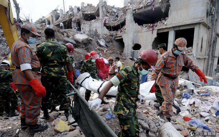 事實上,在倒塌前一天,大樓已經出現裂痕,也吸引當地媒體報導,但工廠老闆不顧危險仍要求工人照常上班,沒想到最後釀成嚴重死傷,工廠老闆甚至因害怕逃跑,最後仍被警方逮捕。回顧當時意外現場,成堆原本要送往歐美各國的的衣料全成了運送傷患的臨時擔架。