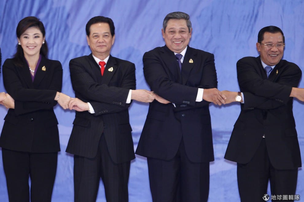 2011年的東南亞聯盟(ASEAN)會議上,(左至右)泰國、越南、印尼、柬埔寨等國領導人握手拍照。