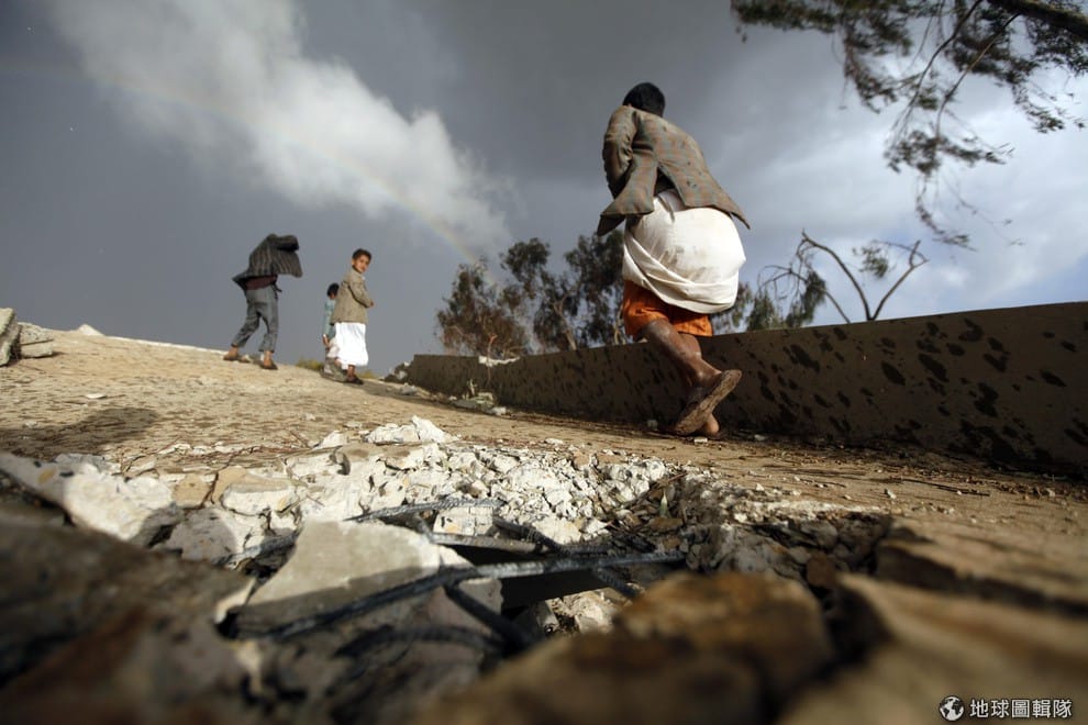 孩子們走過剛遭到什葉派胡賽(al-Houthi)軍事分子攻擊的校區。
