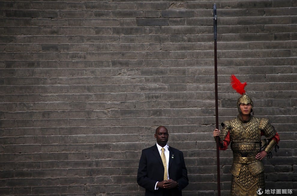 照片中左邊是美國第一夫人蜜雪兒(Michelle Obama)的保全人員,他站在西安城牆著古裝打扮的衛士旁。