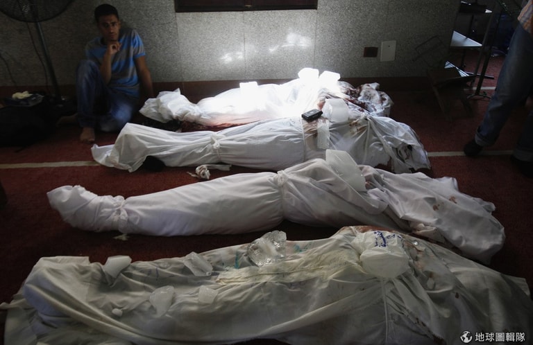 2013年8月14日,埃及出現穆爾西政權來最血腥的衝突,警民喪生數百人。照片中可見包上裹屍布的遺體放在地上。