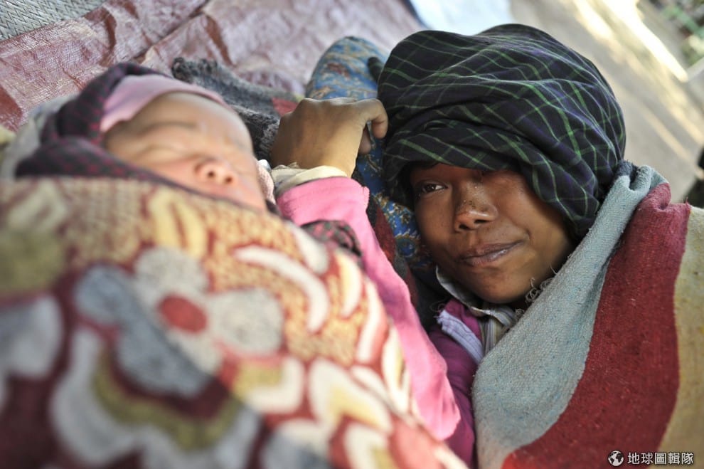 在地震中受傷的母親和她的寶貝,只能躺在地上休息。圖片來源:Kaung Htet/Getty Images