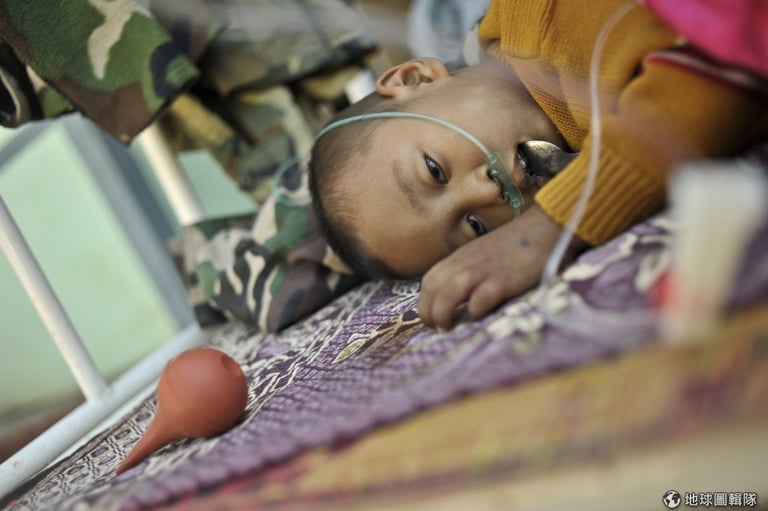醫院被震毀了,一名還接著管子的病患只能被移到戶外安置。圖片來源:Kaung Htet/Getty Images