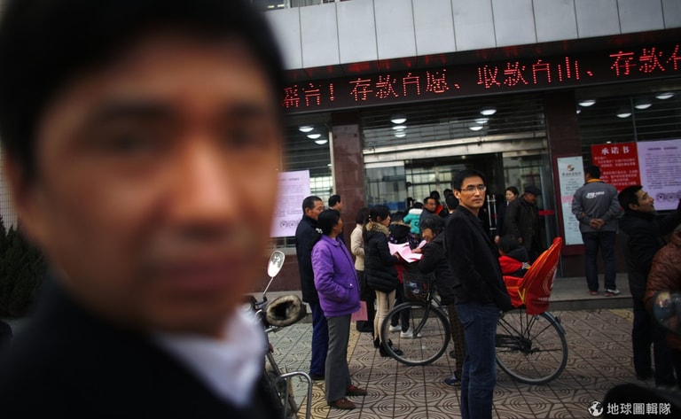 江蘇省鹽城縣的民眾聚集在銀行前,當地近幾天傳出2家銀行的財務出現問題,擔心沒有錢可領的民眾在銀行外排成人龍。
